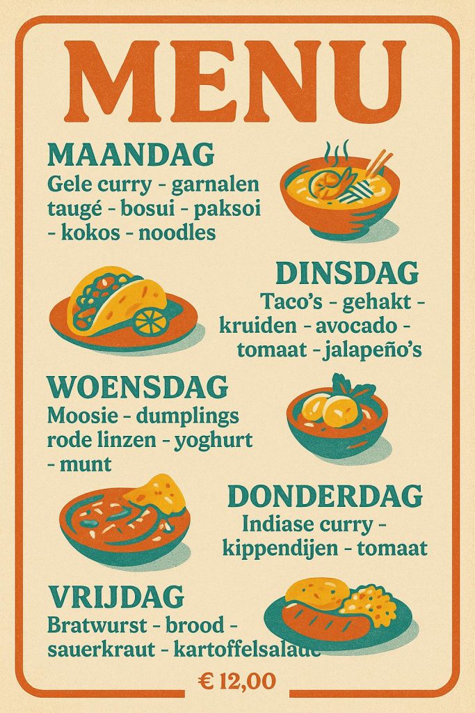 - Maandag: Gele curry met garnalen, taugé, bosui, paksoi, kokos en noodles.